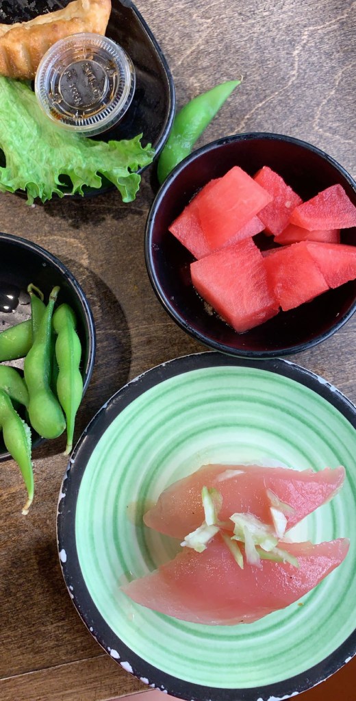 The food on the conveyor belt is varies from simple nigiri to very exotic dishes such as “salmon skin nigiri” to “NY cheesecake” (which is actually high quality!!). I recommend going if you aren’t a picky eater, love sushi, and are willing to try some uncommon dishes for a typical American sushi restaurant such as steak nigiri and watermelon (great palette cleanser!).