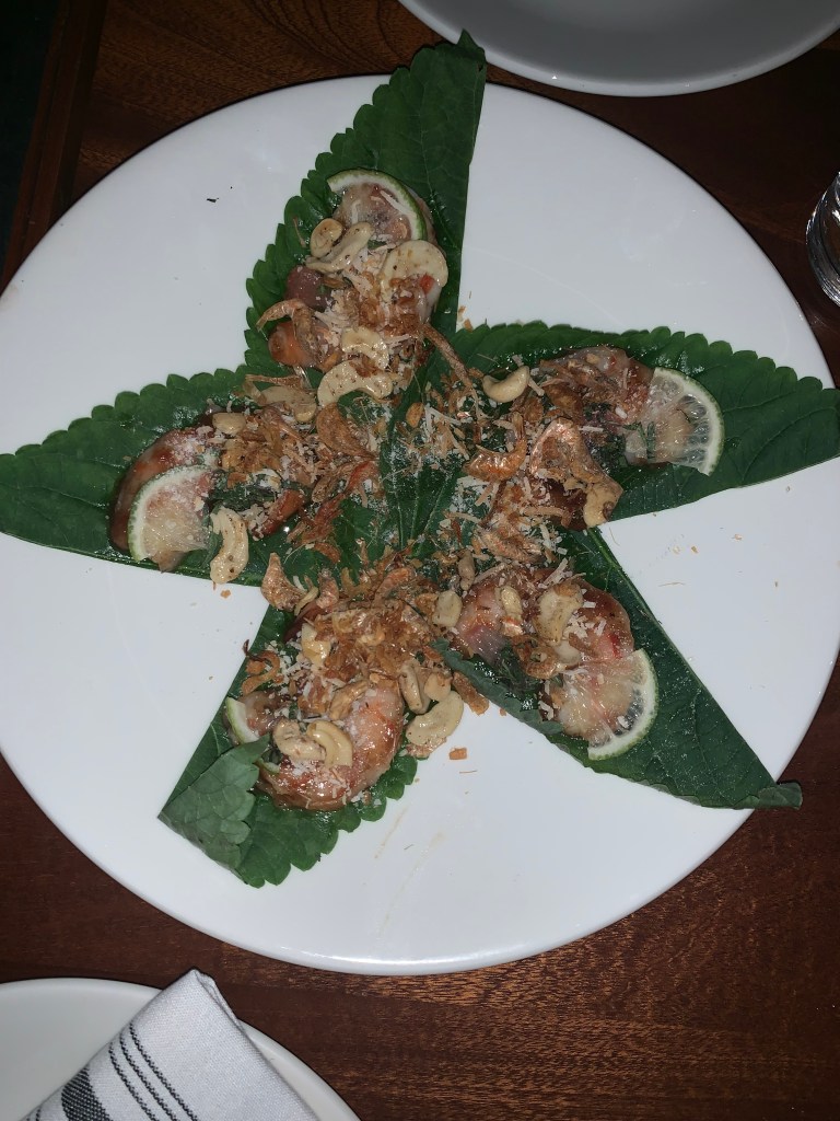 Next was the “Prawn Miange,” which was a betel leaf, toasted coconut and cashews, lime, fresno chile, and grapefruit.