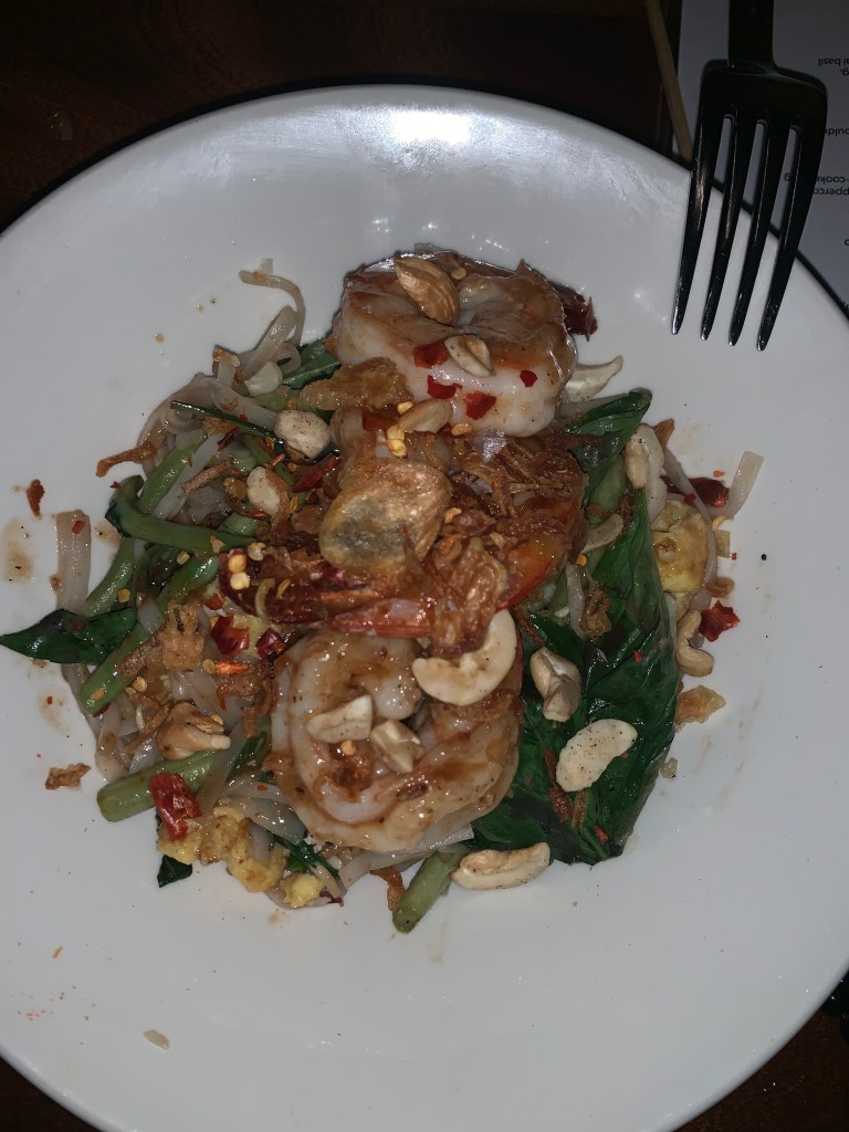 “Pad Thai Kung”: rice noodle, blue prawn, tofu, egg, toasted cashew, bean sprout, thai basil.