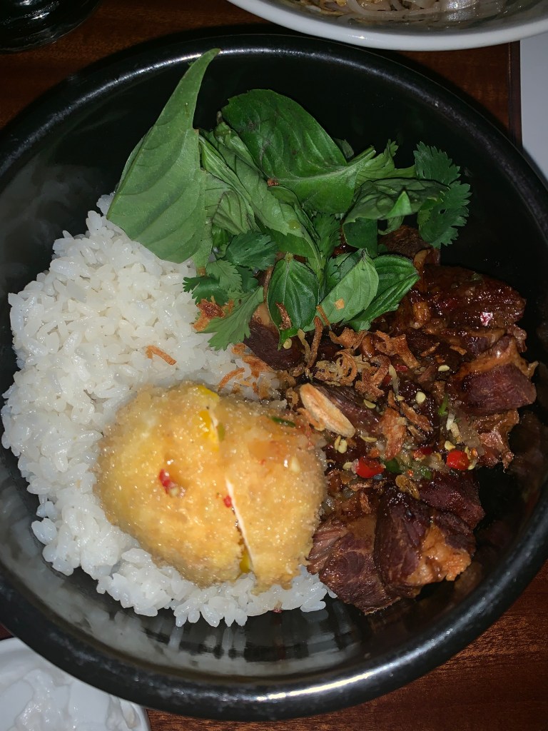 This dish was insane. By far the best of the night, and I would definitely return just to eat it again. It was such a comfort-food bowl with a nice/elegant flair and everyone was drooling as soon as we saw the soft egg. The proportion of egg to pork to rice to herbs was perfect, the presentation was beautiful (I mean look. at. that) and as soon as we mixed it together, each bite had loads of flavor and great texture. The sauce completely reminded me of eating a bowl of ramen, it had the exact same delicious flavor, and it stuck to the sticky rice perfectly. The pork was so tender and melted in my mouth, and the soft egg flavor only enhanced the amazing sauce flavor.