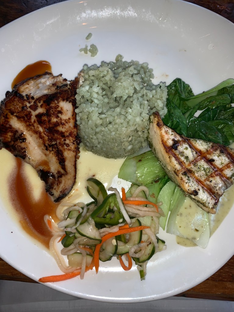 Last but not least, this nice restaurant had to be mentioned. The atmosphere is so cool in here, it’s located in a shopping plaza in Poipu, but once you walk inside, you would think you’re in a tropical garden, because you are. There’s a more casual side with a large tiki-hut bar, then the nicer side with a more formal menu where we ate. The entire restaurant is facing the gorgeous garden and is also in eye’s view of the live music and hula dancer. I only took pictures of my meal, but I had the fish special served two different ways and the ahi tuna for an appetizer. Both were extremely delicious! The fish had two very different flavors that contrasted well—one was a miso glaze and the other had a more tart, lemony sauce. The ahi was super fresh (as it’s been all trip haha), so really no complaints there. I would definitely recommend coming here for a nice meal and some great ambiance—plus they had hula pie… so even more of a reason to go!