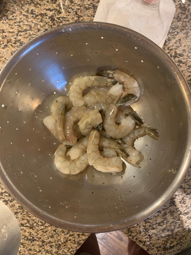 This was honestly the most time constraining part of cooking this entire dish… I left the tails on for a prettier presentation. Using scissors, I cut from the bottom of the shrimp to the tail, then removed the peel and deveined. Then I gave them a quick wash to remove any gross juices (eww) or salt water. I found it an easier cleanup to use the bag they came in to put the peels in, and I put the clean shrimp in the strainer. Then I could just seal and throw the entire bag away without a gross smell lingering in the trash.