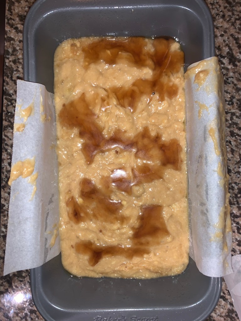 Taking a toothpick or any other small pick, swirl syrup into batter. Put it into oven and check on it every 15 minutes, but it should take roughly an hour. Remove when toothpick comes out clean and let rest. Using parchment paper, remove from pan, slice, and enjoy!!!!