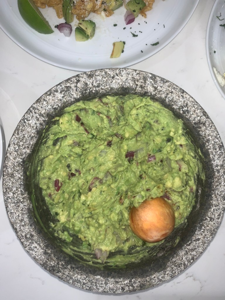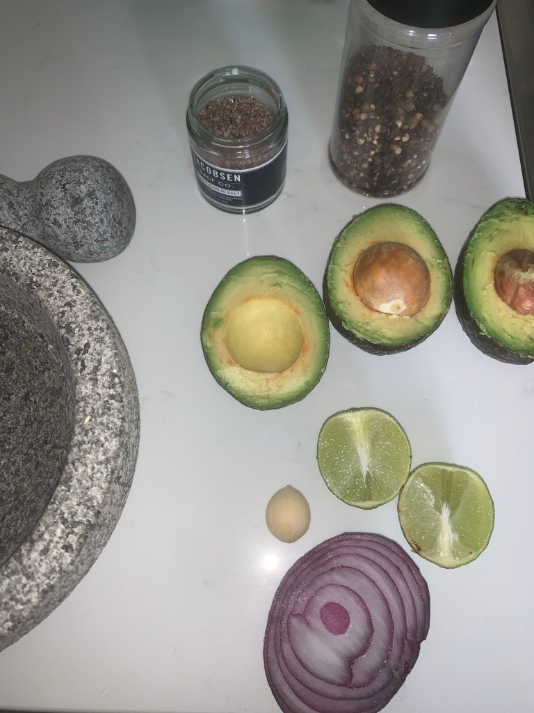 I used a mortar and pestle to make and serve the guac, but you can easily accomplish this in a bowl. Start by grinding up your garlic clove, then add in the avocados and mash with a fork till you get a chunky but soft consistency. Then add in diced onion, lime juice, and cilantro and stir to combine